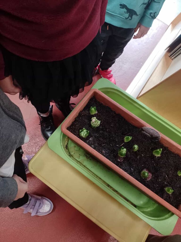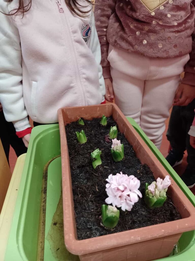 È arrivata la primavera! Elementi prodromici di coltivazione arboree già alla Scuola dell’Infanzia. Dopo aver seminato bulbi di giacinti i bambini ora possono ammirarne i fiori con i loro colori e profumi!