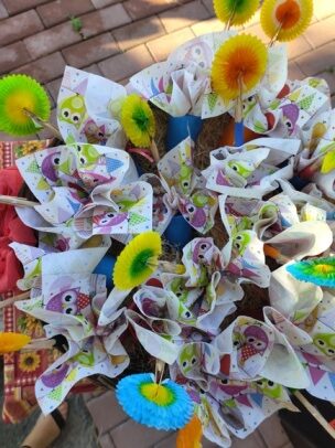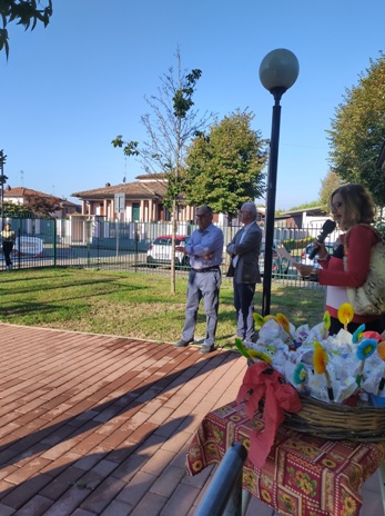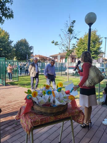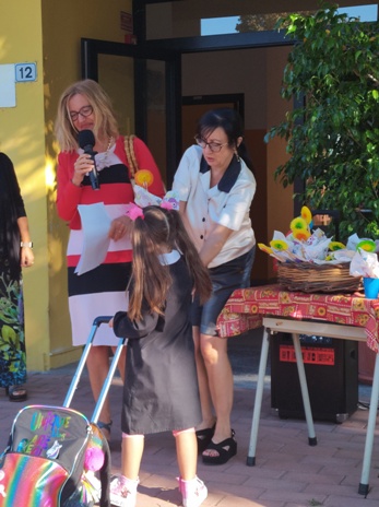 I nuovi alunni sono stati chiamati per nome uno dopo l’altro e quindi accompagnati a varcare la soglia dell’edificio; la maestra Mariangela ha donato a ciascuno un piccolo pensierino .