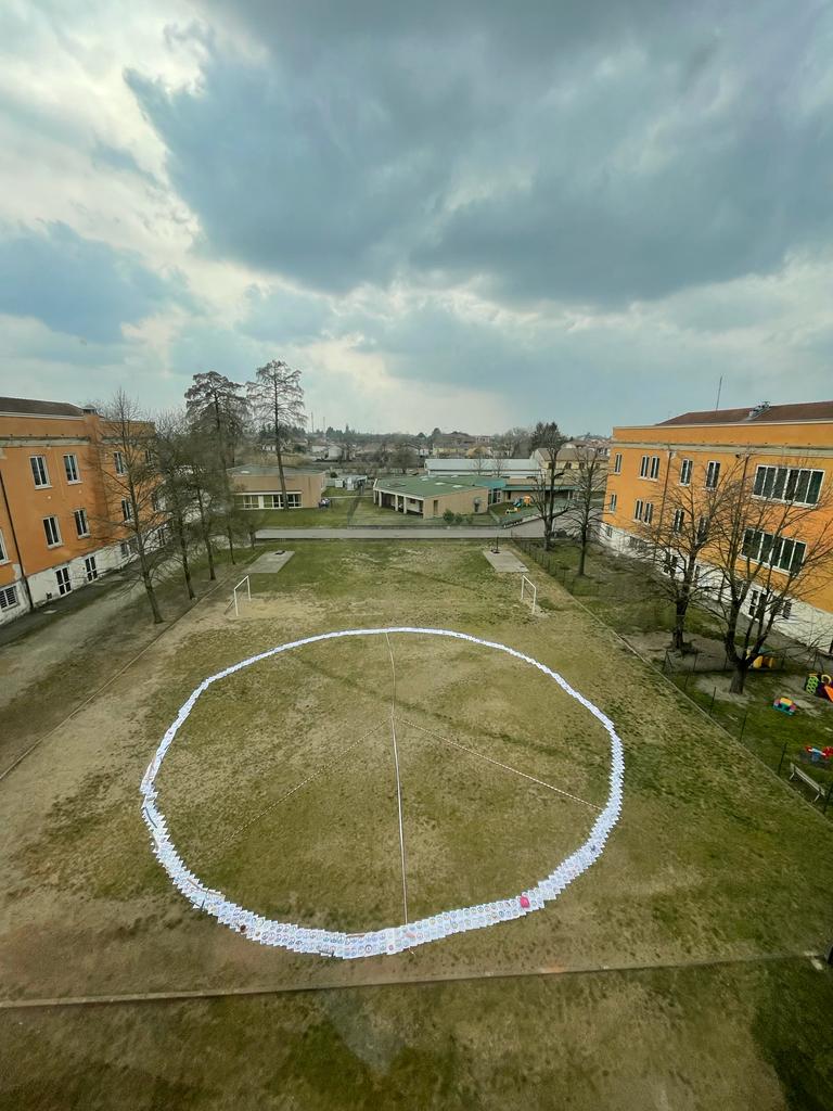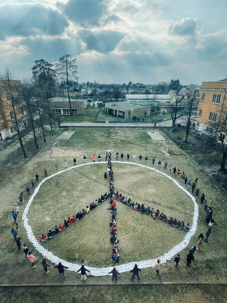 Hanno realizzato più di 500 disegni raffiguranti il simbolo della pace che, posizionati a terra nel cortile interno, e completati dalla posizione dei bambini hanno formato un enorme disegno.