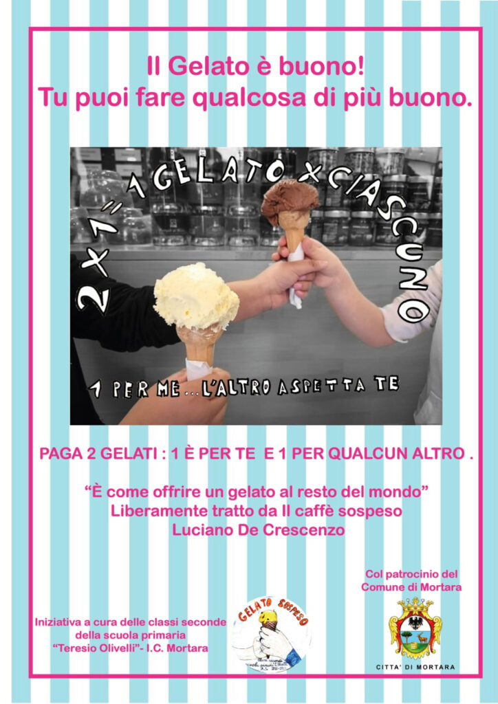 È nata così l’idea del GELATO SOSPESO, rivolta ai rivenditori di gelati della città. I bambini hanno realizzato il logo e le locandine che saranno esposte in tutti i negozi che aderiranno all’iniziativa, valida per tutto il periodo estivo. Si potrà lasciare un gelato sospeso per i bambini.