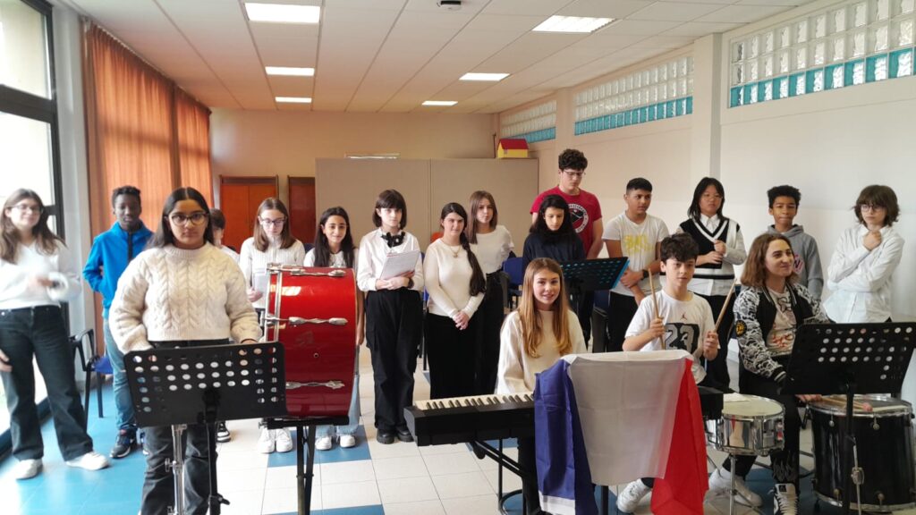La classe 2^ D sezione musicale ha omaggiato i coetanei d’Oltralpe suonando a sorpresa la loro “Marseillese” durante una videoconferenza del gemellaggio del nostro Istituto, sotto la sapiente guida della Prof.ssa di lingua francese, Ombretta Emondi, inno in onore del legame e dell’amicizia fra le due scuole.