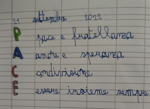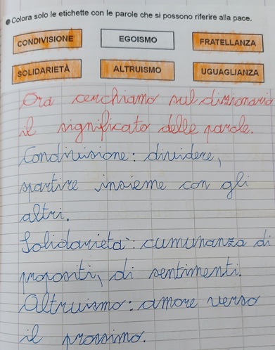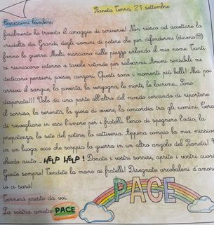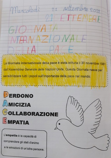 Il 21 settembre, in occasione della “Giornata Internazionale della Pace”, gli alunni di tutte le classi della Scuola Primaria di Parona sono stati coinvolti dalle loro insegnanti in percorsi didattici riguardanti il tema della pace; quest’ultima da intendersi non solo come “assenza di guerra ”, ma come tutela della dignità e dei diritti della persona umana. Attraverso proposte didattiche mirate, i bambini sono stati guidati nella realizzazione di attività volte a comprendere l’importanza del rispetto del prossimo.