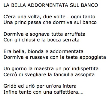 In sinergia con le proposte musicali, le insegnanti hanno curato la parte recitativa dello spettacolo, attraverso la simpatica e divertente parodia in rima di tre fiabe: Alice nella scuola delle meraviglie, Pinocchio e La bella addormentata sul banco.