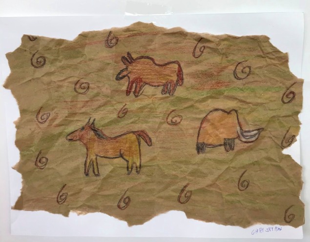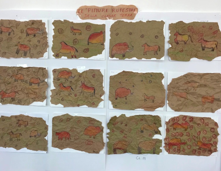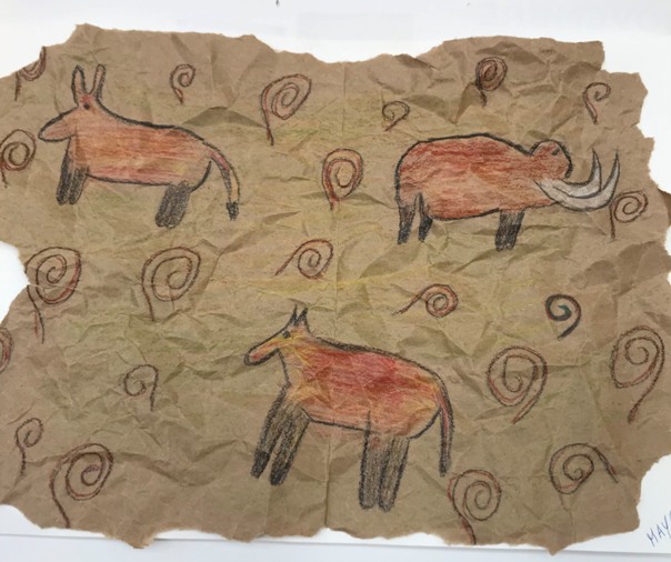 Pitture rupestri preistoriche su carta stropicciata per riprodurre le grotte. I disegni e i colori rispecchiano l’espressione artistica dell’uomo preistorico.