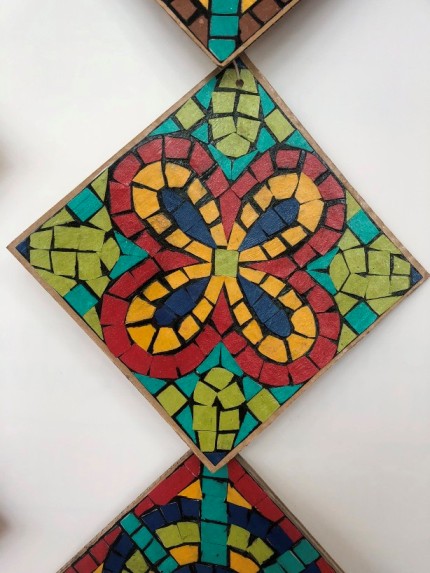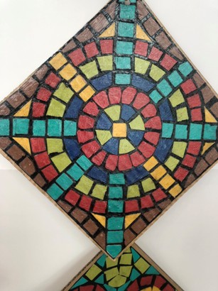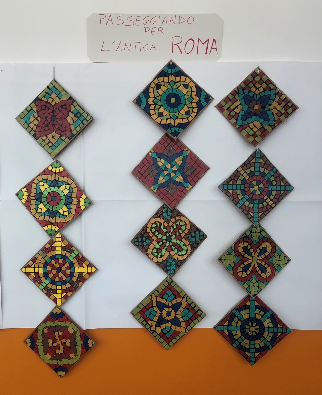 Attività con la tecnica del mosaico. Gli alunni hanno ritagliato i tasselli di cartoncino, li hanno incollati e verniciati per riprodurre le mattonelle delle domus dell’antica Roma.