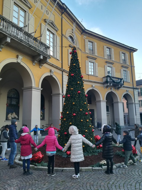 Con l’approssimarsi dell’evento natalizio, la classe IV C della Scuola Primaria, durante la “passeggiata culturale” per le vie cittadine, alla scoperta di monumenti, lapidi ed opere d’arte, mercoledì 12 dicembre, si è riunita intorno allo scintillante albero di Natale in piazza del Municipio e al simpatico Albero della Solidarietà realizzato, insieme alla capanna della Natività (davanti al Palazzo Lateranense), dalla Contrada La Torre.