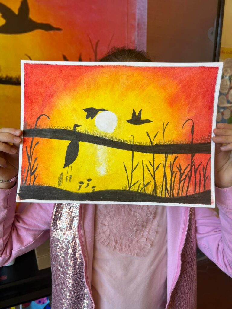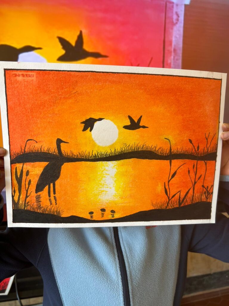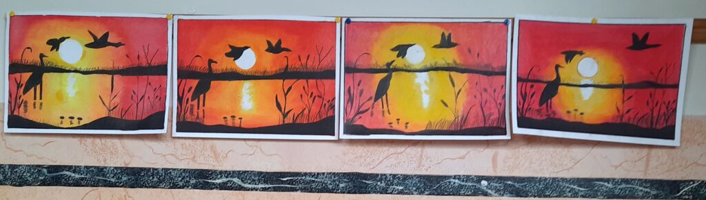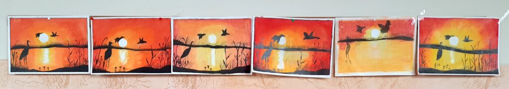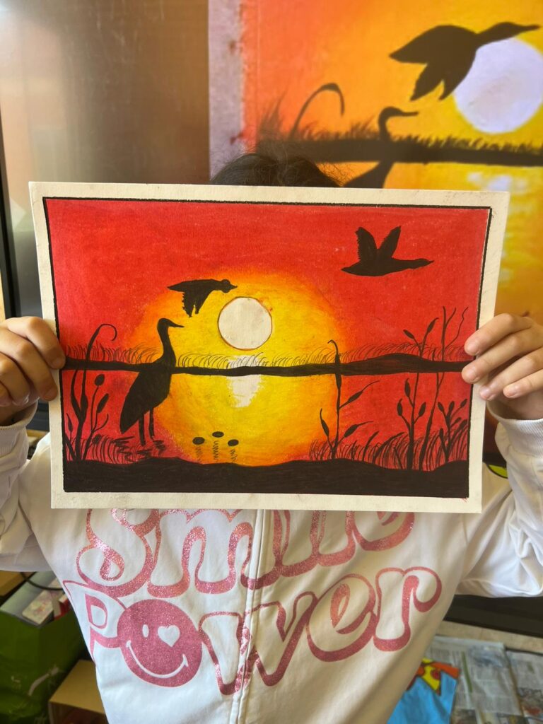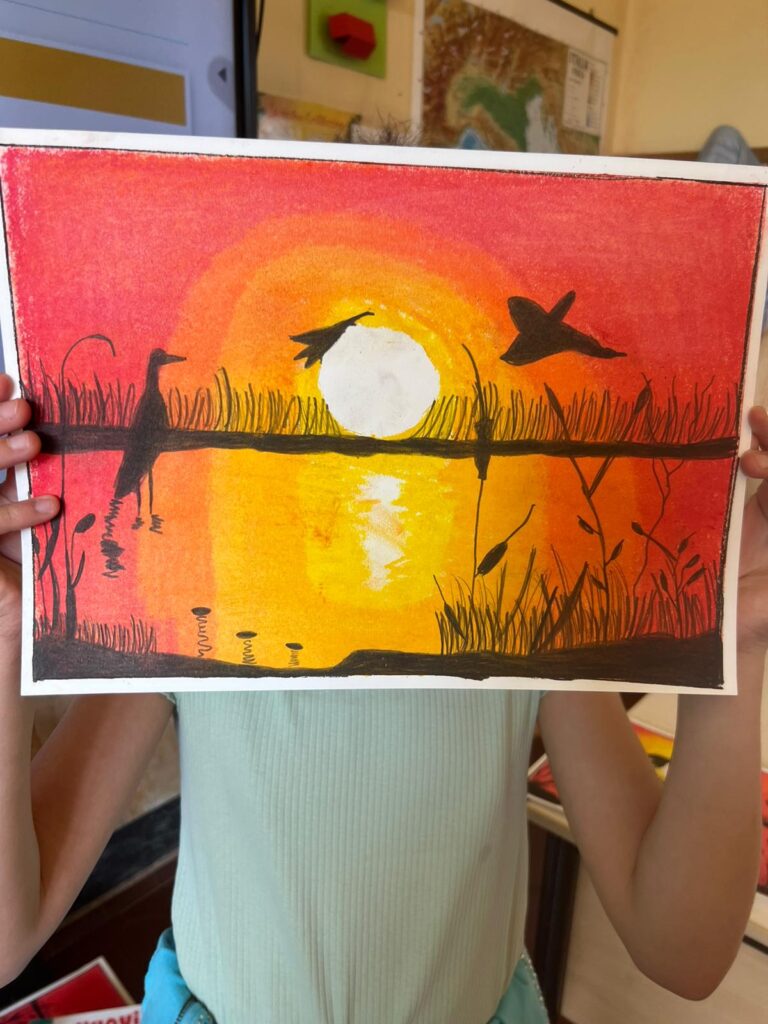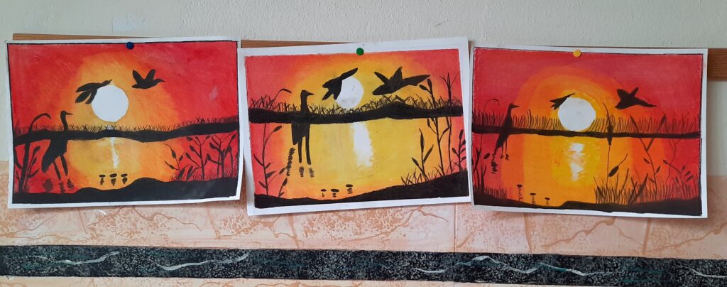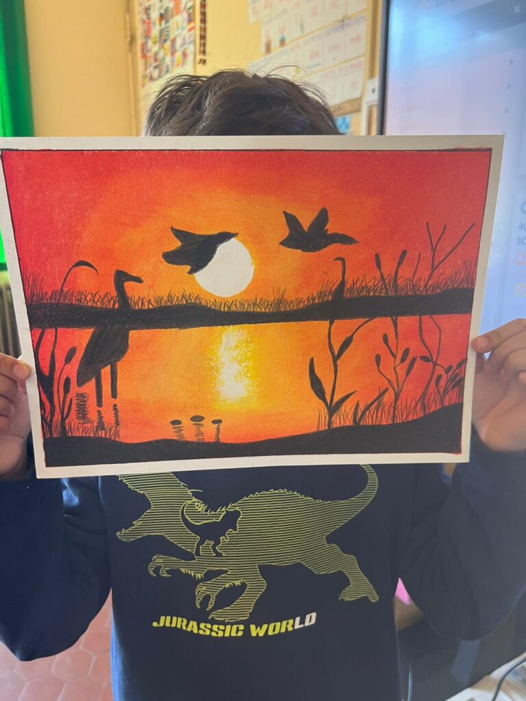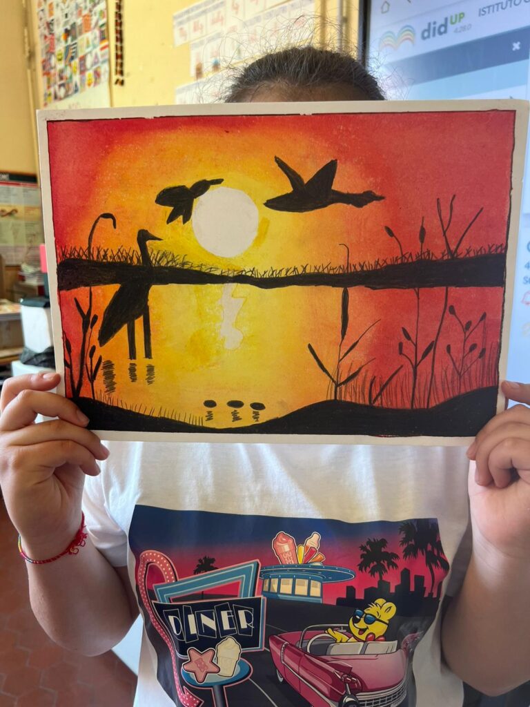 Opere realizzate dagli alunni della V C con pastelli ad olio, sfumando il colore con fazzoletti di carta; cornice di scotch di carta.