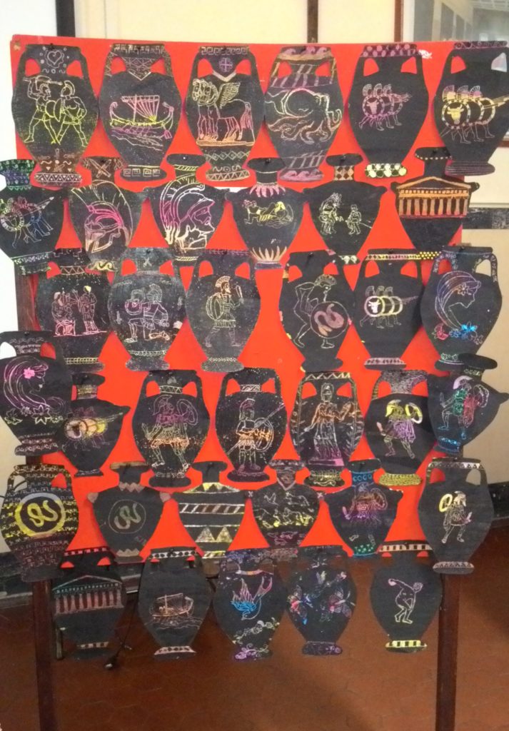 Copiando l’arte dei Cretesi si sono impegnati a riprodurre i loro vasi utilizzando cartoncino, pastelli a cera, tempera nera e stuzzicadenti per colorare con la tecnica del graffito.