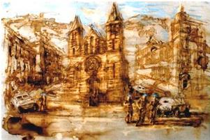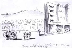 Con questi disegni, tratti dal catalogo della mostra Io volontario dell’arte a Sarajevo, il pittore vuole testimoniare in prima persona la distruzione provocata dalla guerra.